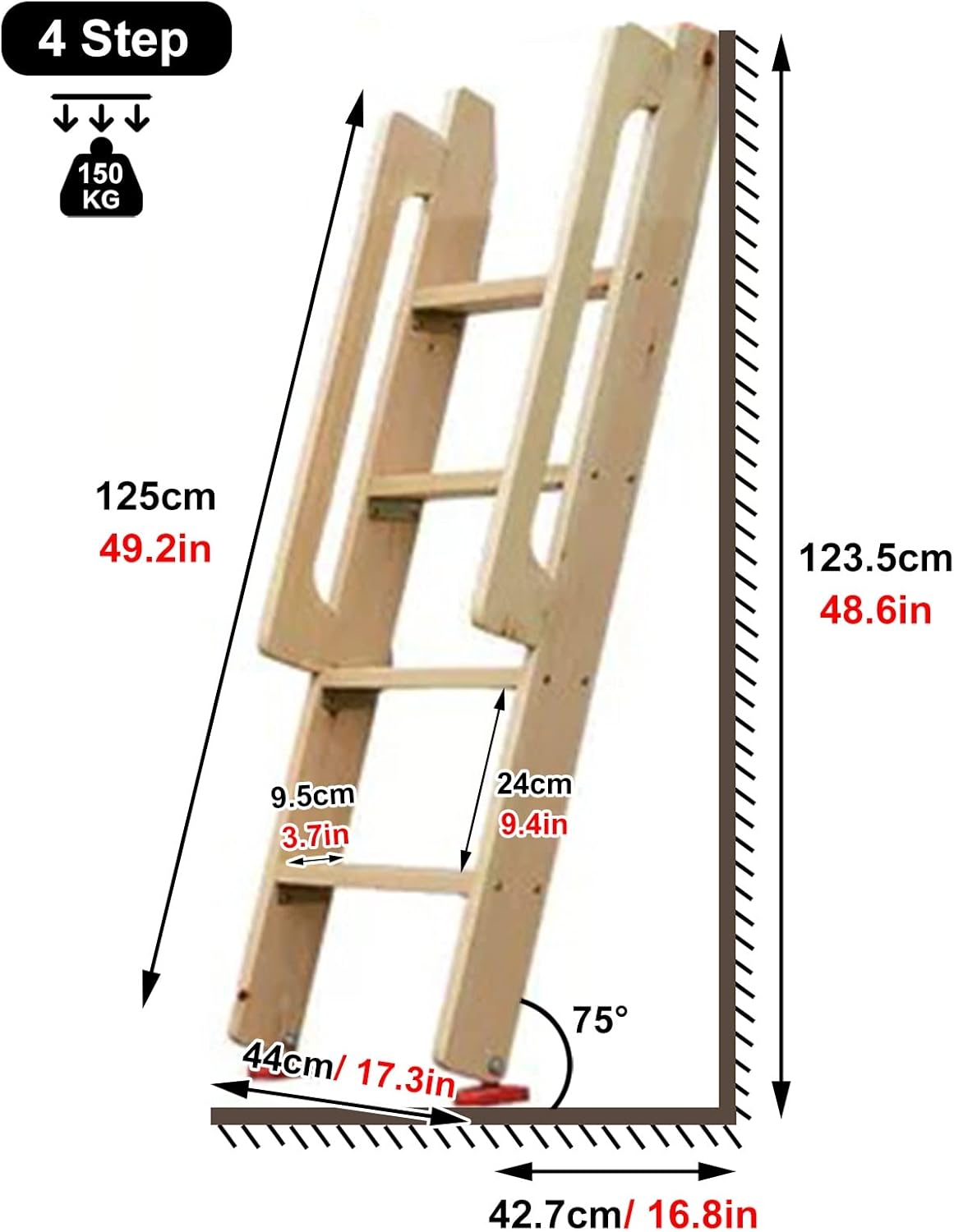 Whether itβs meant for your child to climb up into bed or for you to kiss them goodnight, bunk bed ladder is a stable camper bunk ladder.π Package contents β 1 Γ Bunk Ladder (Including All Mounting Accessories)π Specificationβ Material: Solid Woodβ Color: Natural, Brownβ Optional Sizes:4 Steps: 44 cm x 125 cm/ 17.3 inch x 49 inch5 Steps: 44 cm x 150 cm/ 17.3 inch x 59 inchβ Overall Width: 44cm/ 17.3inchβ Rungs Apart Distance: 24cm/ 9.4inchβ Load Capacity: 150kg/ 330Lbsβ Whether to Assemble: Yesπ Featuresβ Easy storage and transport, lightweight, compact, sturdy, portable.β It can also be used as an attic ladder, loft ladder or RV ladder, it's a multipurpose ladder. β This bunk bed ladder can save space for you without always taking up valuable floor space. β All hardware and hooks are included, very easy installation and disassemble, just look at the parts, you will figure it out and can assemble it in a few minutes. π Kindly Noteβ Due to different manual measurement methods, the error is 1-2 cm. β We try our best to make pictures close to the real, BUT lighting, contrast and color display may cause color difference. π After-Sales Service β If you need other sizes or colors, you can contact us by email, we support personalized customization. β If you have any questions about our products or orders, please contact us by email, and we will be happy to assist you and respond to you within 24 hours.β With the aim of \u201cThe Best Quality and Optimum Service\u201d, we are your best choice and faithful friend.